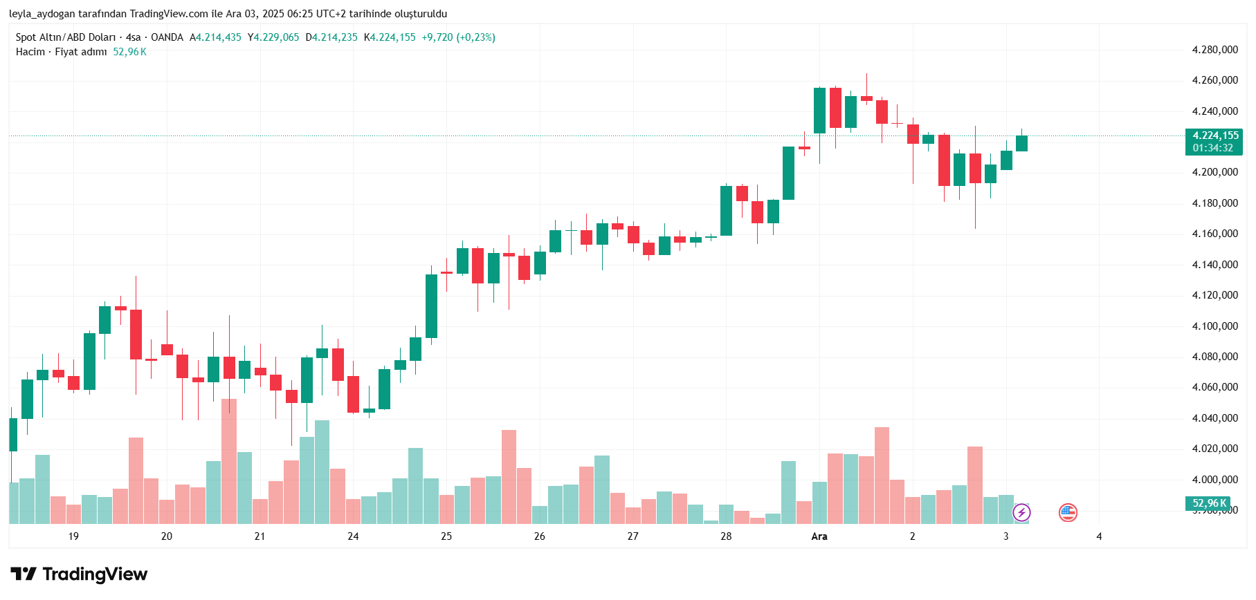 Haftanın üçüncü işlem gününe yükselişle başlayan ons altın kritik seviye olan 4 bin 200 doları geçti. Saat 07.25 itibarıyla 4 bin 223 dolarda hareketleniyor.