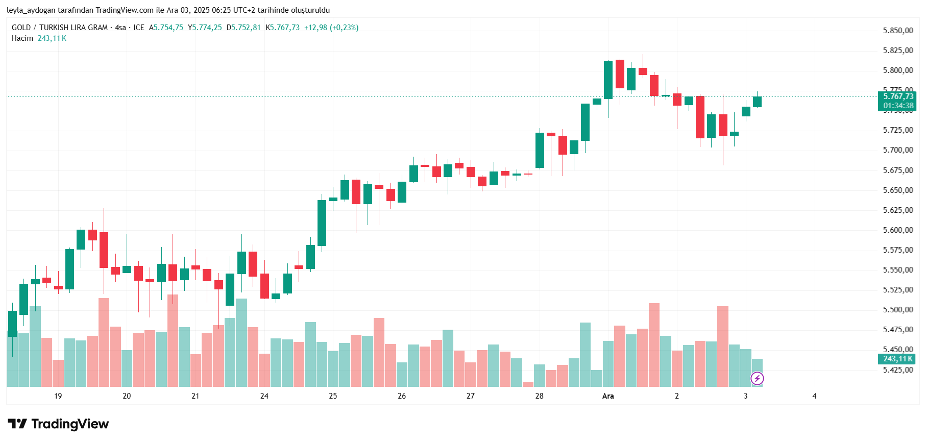 Ons altındaki yükseliş dolar/TL kurunun da yükselmesiyle birlikte yurt içindeki gram altın fiyatlarını da etkiledi. Gram altın aynı saat itibarıyla 5 bin 767 lirada bulunuyor.