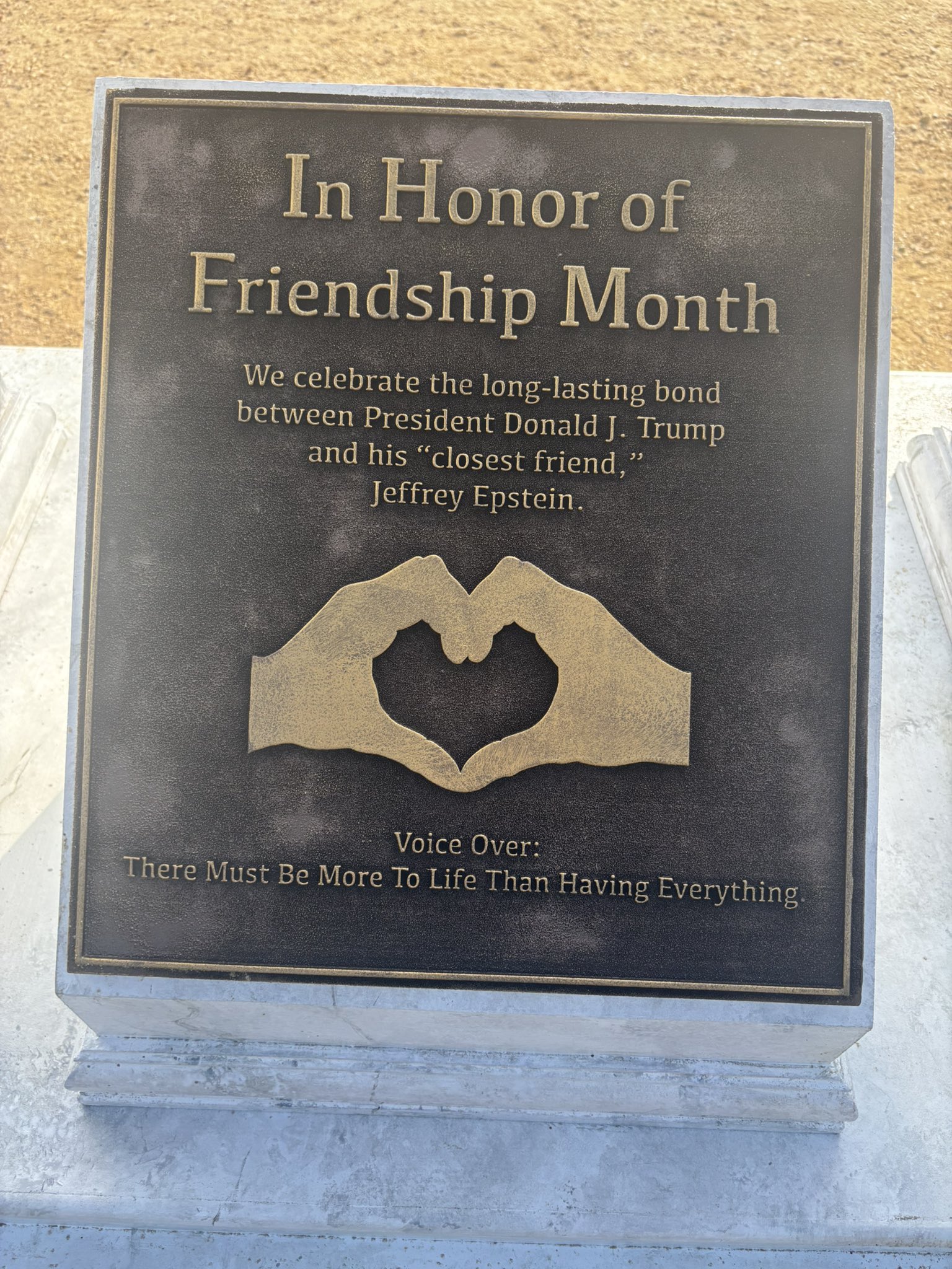 “Sonsuza Kadar En İyi Dostlar” adı verilen heykelde Trump ve Epstein, sırtlarında gülen ifadelerle, el ele tutuşmuş ve bir tür mutluluk ifadesi olarak tek ayaklarını havaya kaldırmış halde görülüyor. Heykelin kaidesine iliştirilen plakaların birinde “Başkan Donald J. Trump ve onun en yakın dostu Jeffrey Epstein arasındaki uzun soluklu bağı kutluyoruz” anlamına gelen ifadeler yer alıyor.