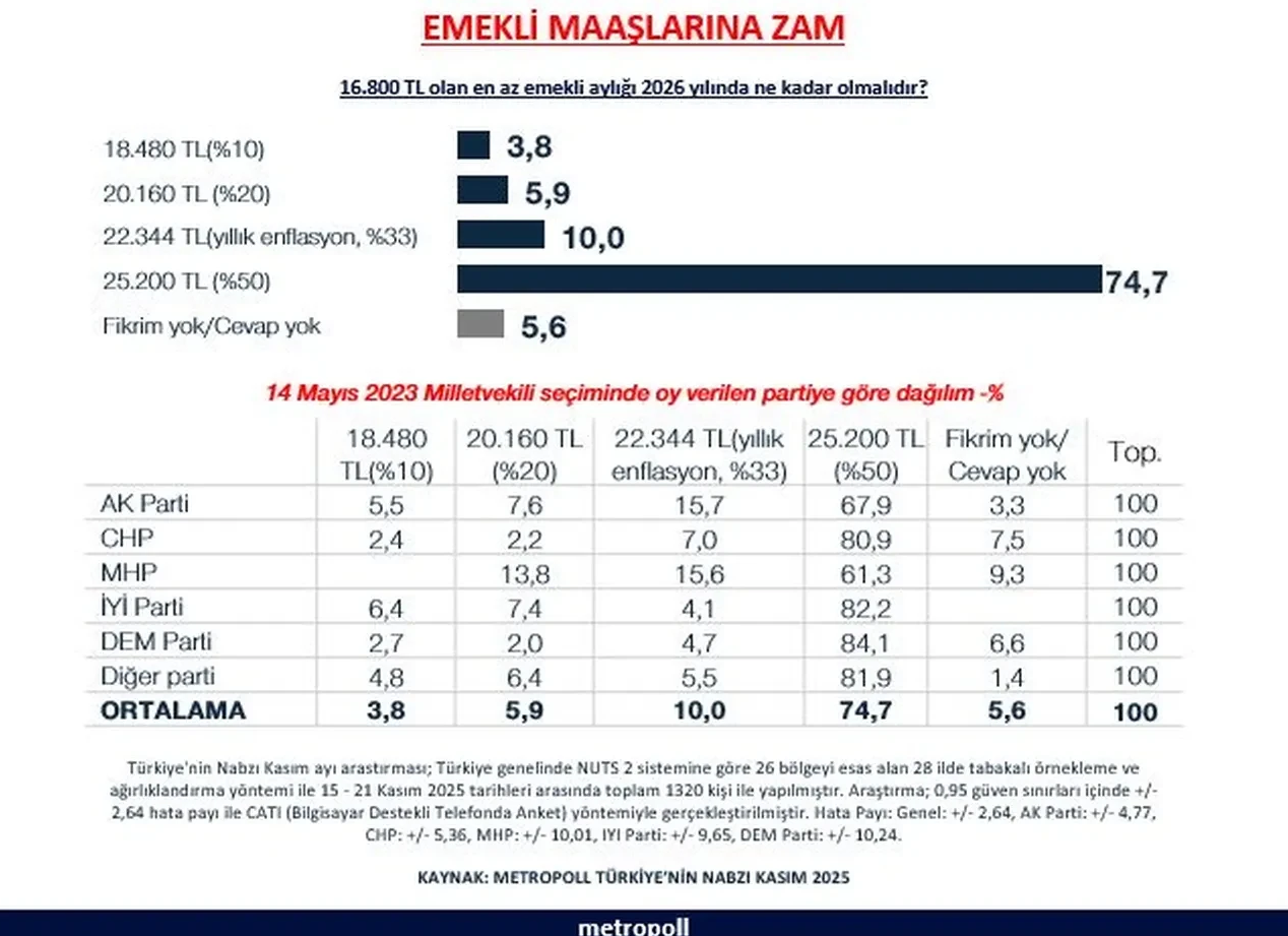 Metropoll’ün Kasım 2025 “Türkiye’nin Nabzı” araştırmasına göre vatandaşlara “16.800 TL olan en düşük emekli aylığı 2026’da ne kadar olmalı?” sorusu yöneltildi.