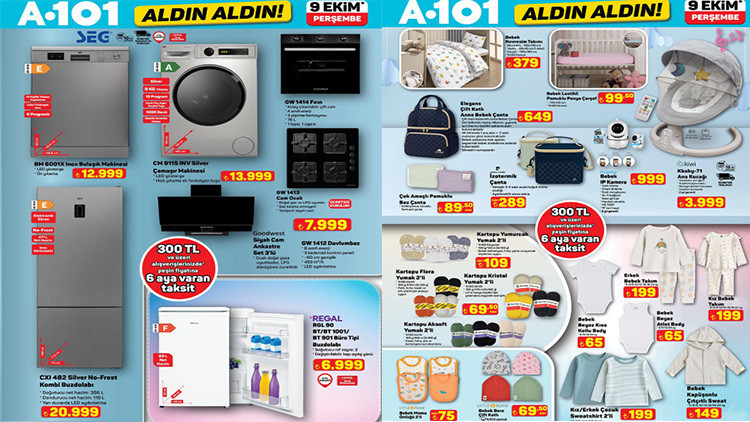 A101 afişi yeni ürünleri yayınlandı. 9 Ekim 2025 Perşembe A101 Aldın Aldın bülteni, çeşit çeşit bebek ürünleri, ultrasonik hava nemlendirici ve otomatik narenciye sıkacağı ile dikkat çekiyor. A101 indirim kataloğu içerisinde; mama sandalyesi 599 TL, küçük çocuk koltuğu 129 TL, siyah cam ankastre set 3’lü 7.999 TL, ultrasonik hava nemlendirici 899 TL, buharlı metal tencere 399 TL, katlanır küvet 499 TL, 65 inç UHD Vidaa TV 24.999 TL, oyuncak tekerlekli bebek yürüme oyuncağı 209 TL, tam otomatik kahve makinesi 14.999 TL, bebek IP kamera 999 TL, koltuk ve halı yıkama makinesi 3.699 TL fiyatıyla raflara geliyor. A101 marketlerde bu Perşembe farklı kategoriden pek çok raflarda müşterileri bekleyecek. Peki A101 afişi Perşembe ürünleri neler? İşte 9 Ekim 2025 A101 aktüel kataloğu (bülten) ürünleri…